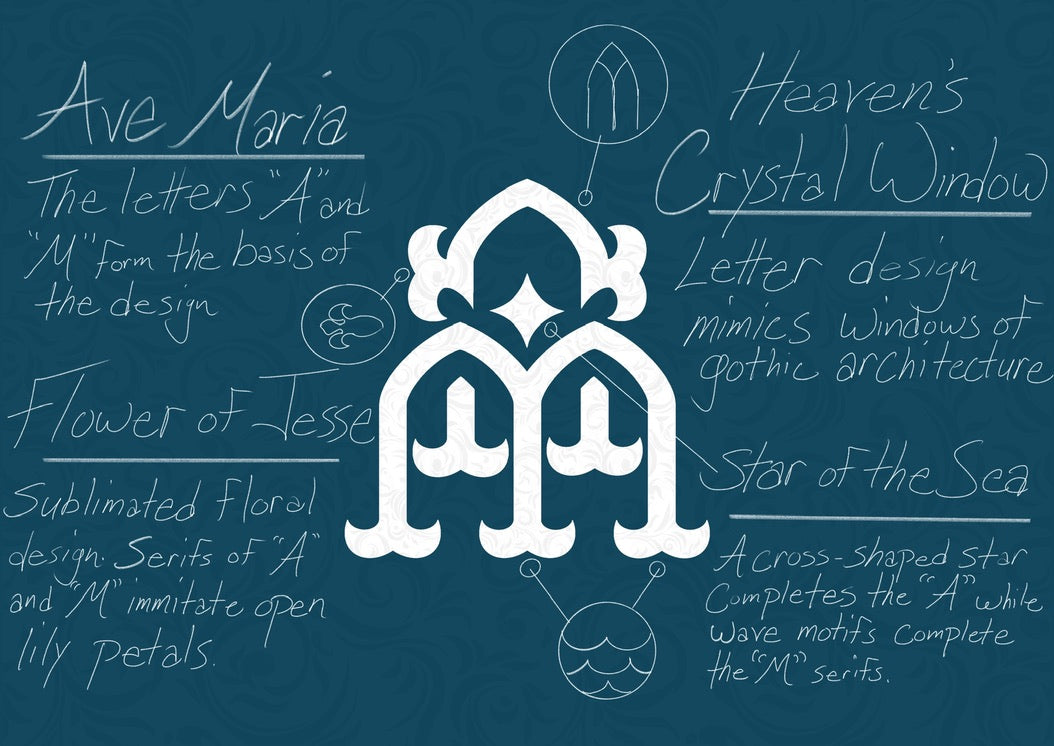 This exclusive logo is my very first release in honor of Our Lady Star of the Sea. Wear graceful artwork that inspires and venerate Mary our guiding star with this emblem that is simultaneously reminiscent of ocean waves and the flying buttresses that grace the most renowned cathedrals dedicated to the Mother of God. All of these elements combine to form the initials for the opening words of the Ave Maria and the poignant Marian chant Ave Maris Stella.